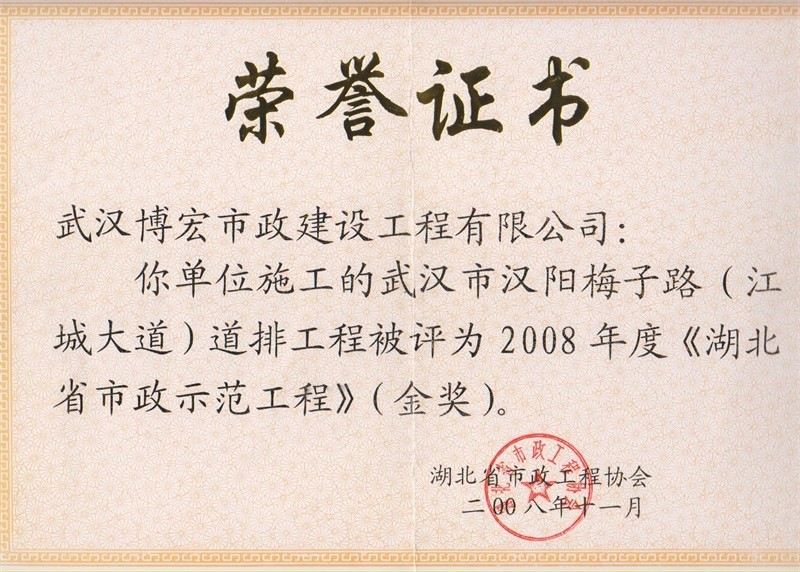 2008年度湖北省市政示范工程金獎(jiǎng)(梅子路道排工程)