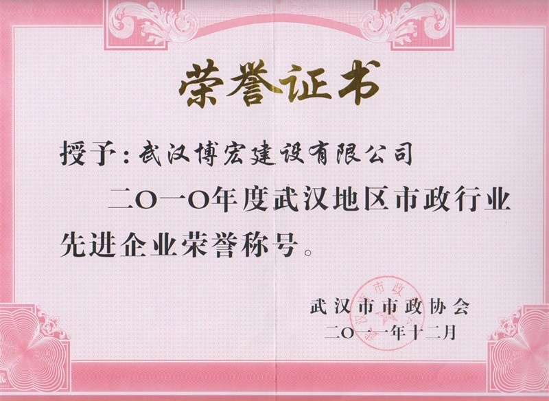 2010年度武漢地區(qū)市政行業(yè)先進(jìn)企業(yè)榮譽(yù)稱號(hào)