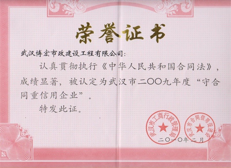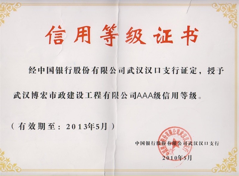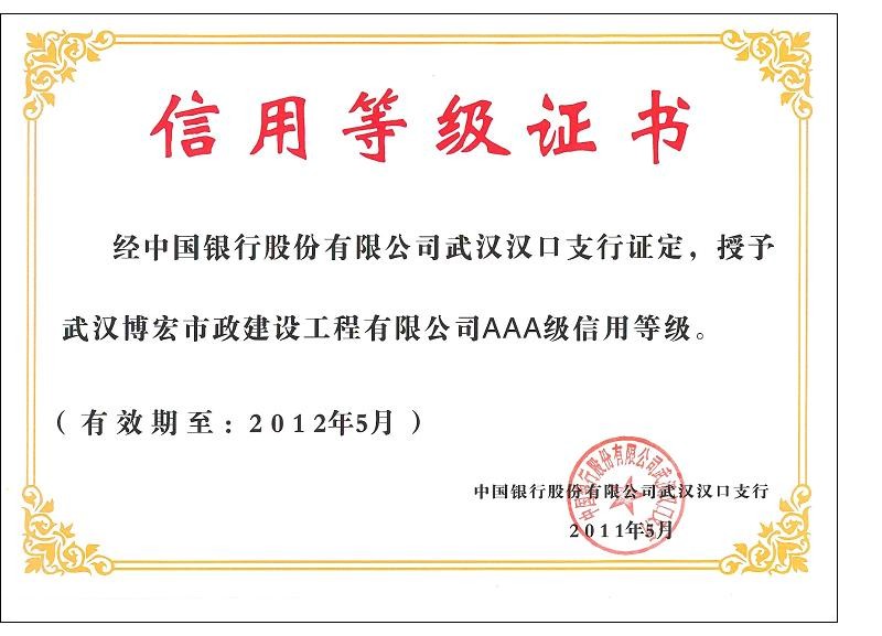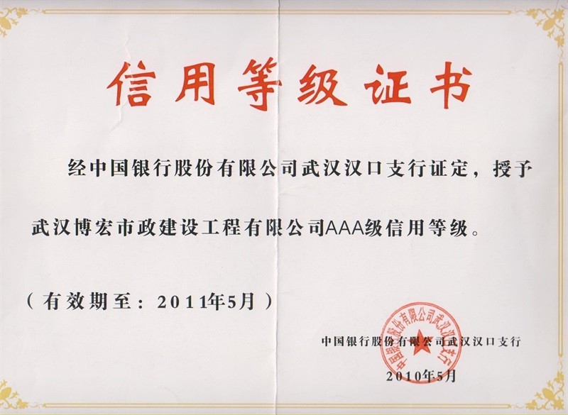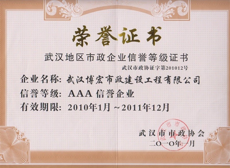 2010-2011年度武漢地區(qū)市政企業(yè)信譽(yù)等級(jí)證書(shū)