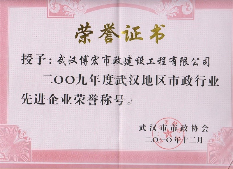 2009年度武漢地區(qū)市政行業(yè)先進(jìn)企業(yè)榮譽(yù)稱(chēng)號(hào)