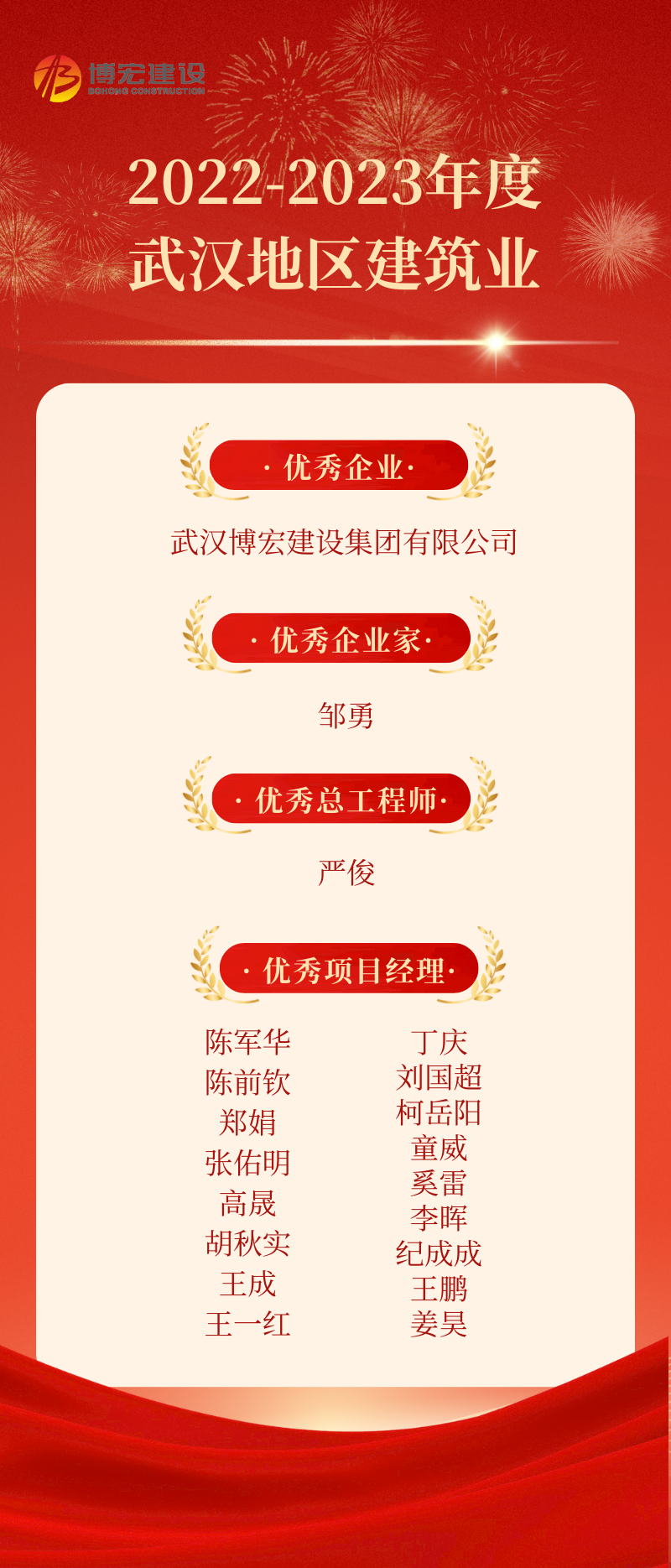 近日,2022-2023年度武漢地區(qū)建筑業(yè)優(yōu)秀企業(yè)、優(yōu)秀企業(yè)家、優(yōu)秀總工程師、優(yōu)秀項目經理選樹結果正式發(fā)布,博宏建設集團喜獲“大豐收”,獲評1項優(yōu)秀企業(yè)、1人獲評優(yōu)秀企業(yè)家、1人獲評優(yōu)秀總工程師、17人獲評優(yōu)秀項目經理!