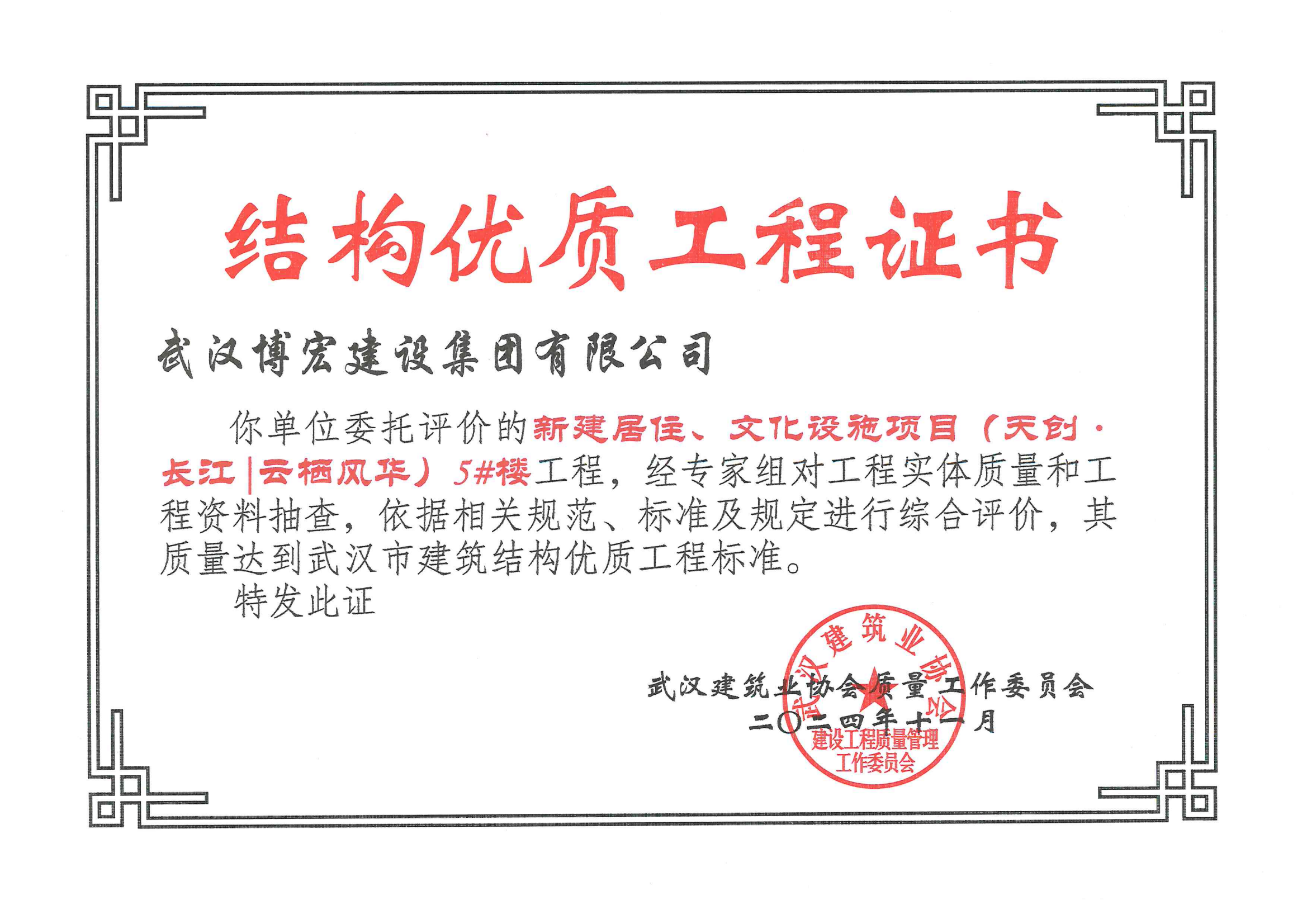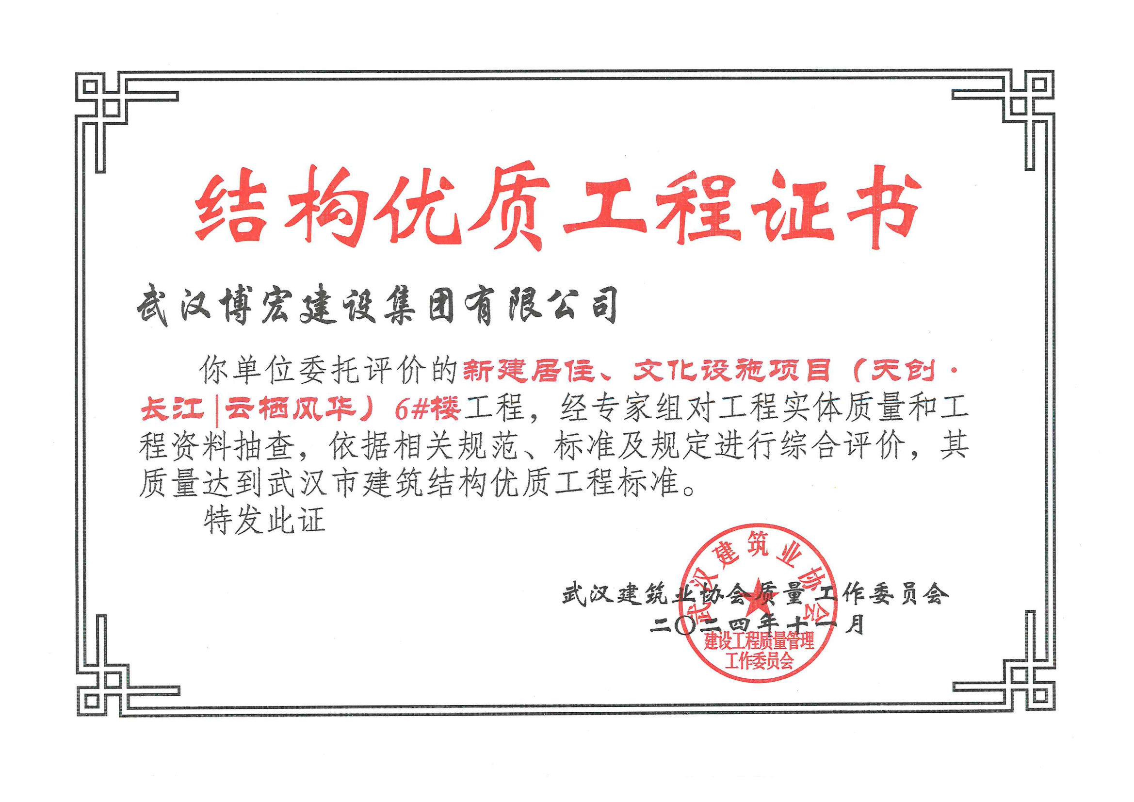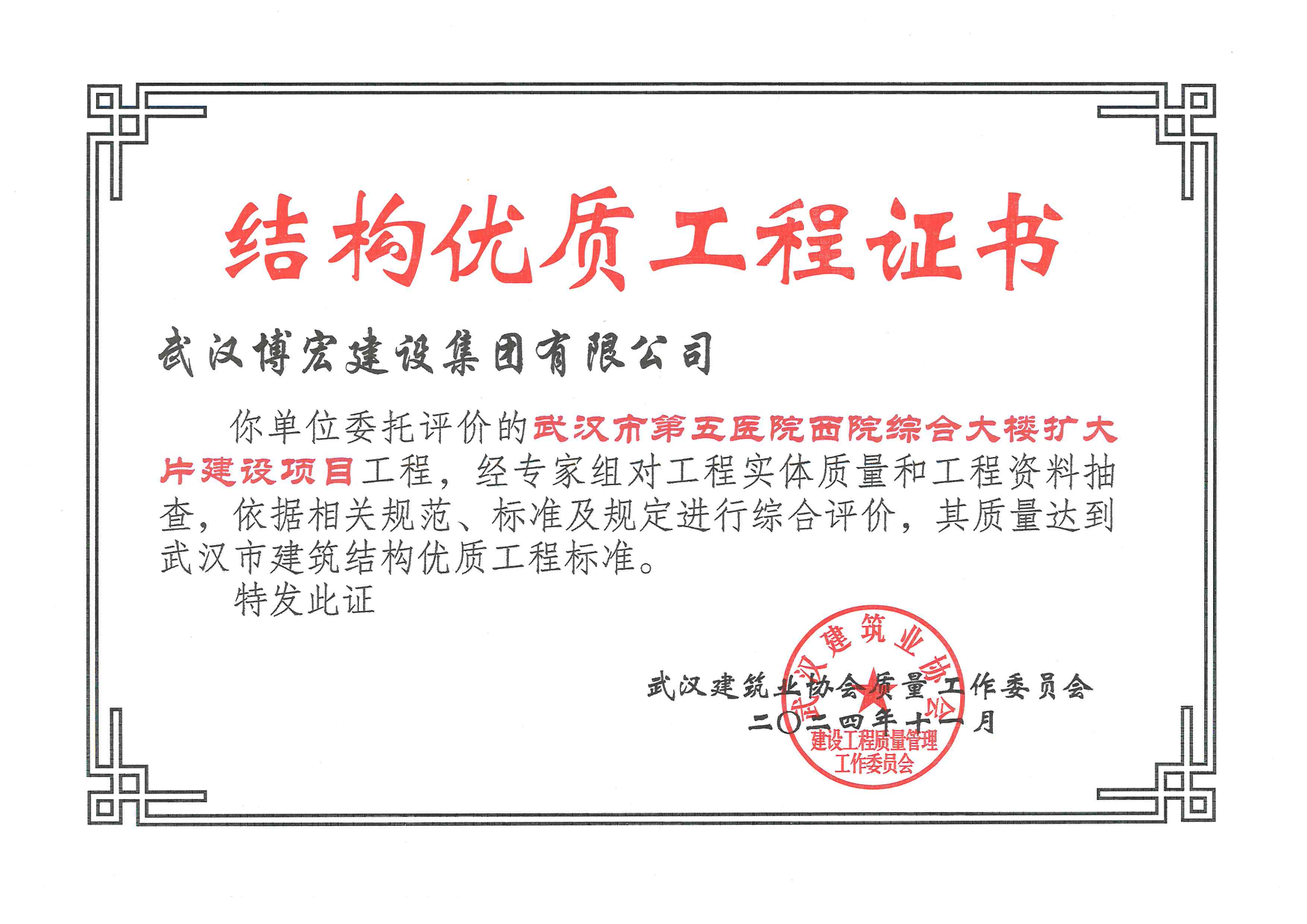 近日,公司承建的武漢市第五醫(yī)院西院綜合大樓擴大片建設項目,新建居住、文化設施項目(天創(chuàng)·長江丨云棲風華)4#、5#、6#樓獲評武漢市建筑結構優(yōu)質工程,標志著項目在工程結構設計、工程施工管理、過程質量控制等方面均達到市級優(yōu)質認證,在安全、耐久、美觀等方面都具有較高的水平。